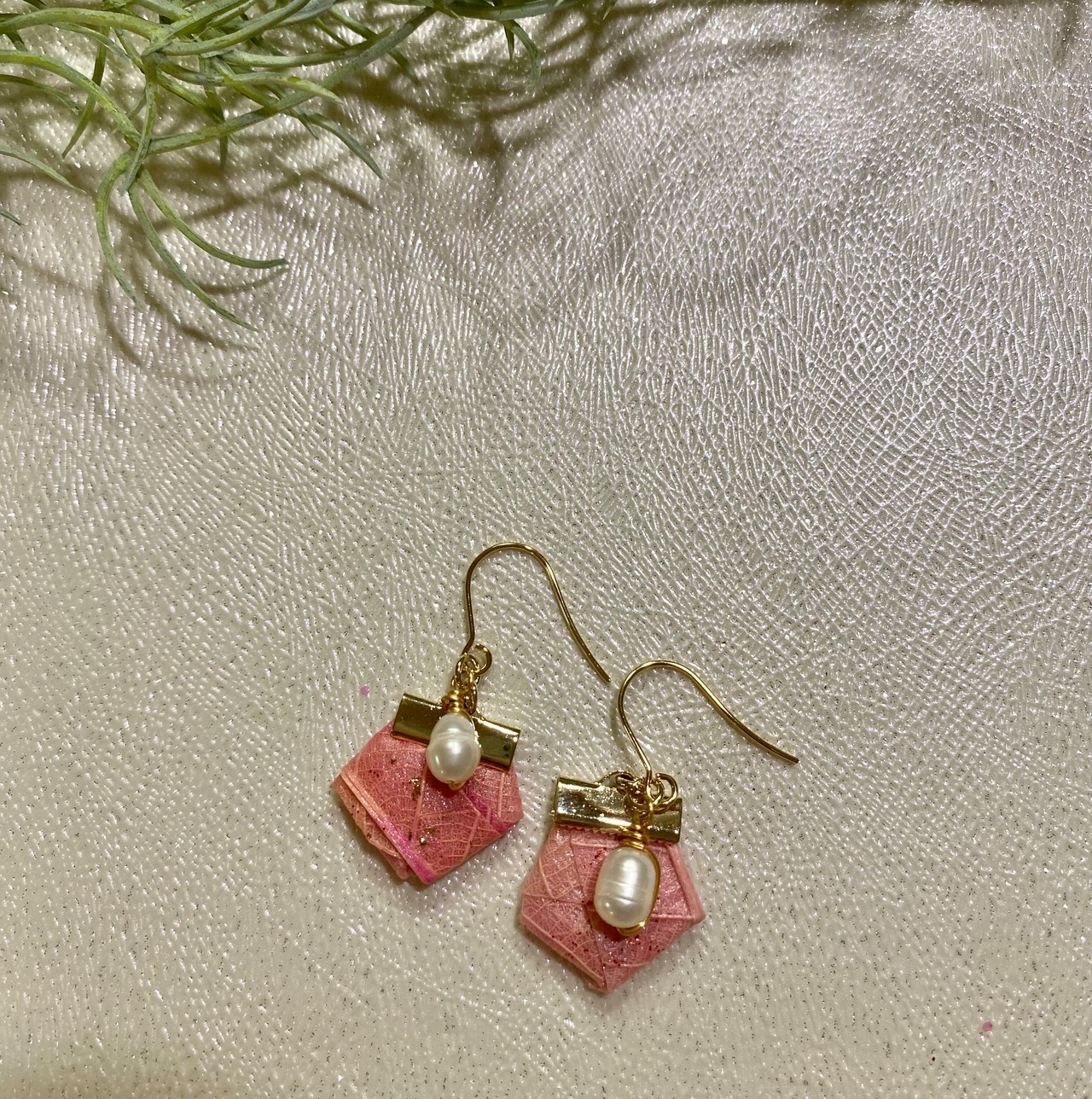 【E6】ボタニーペインティング ゴムの葉五角形ピアス ピンク