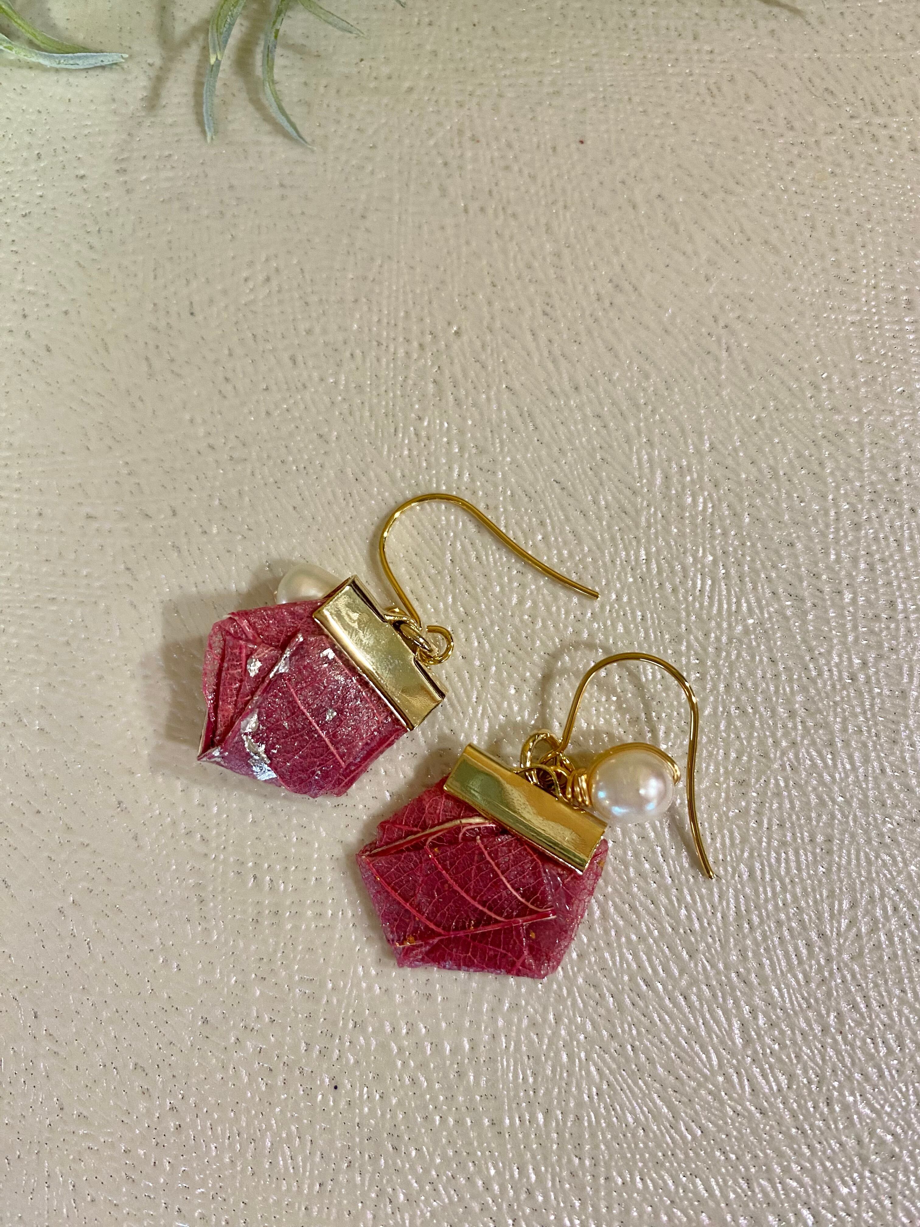 【E9】ボタニーペインティング ゴムの葉の五角形ピアス レッドピンク系