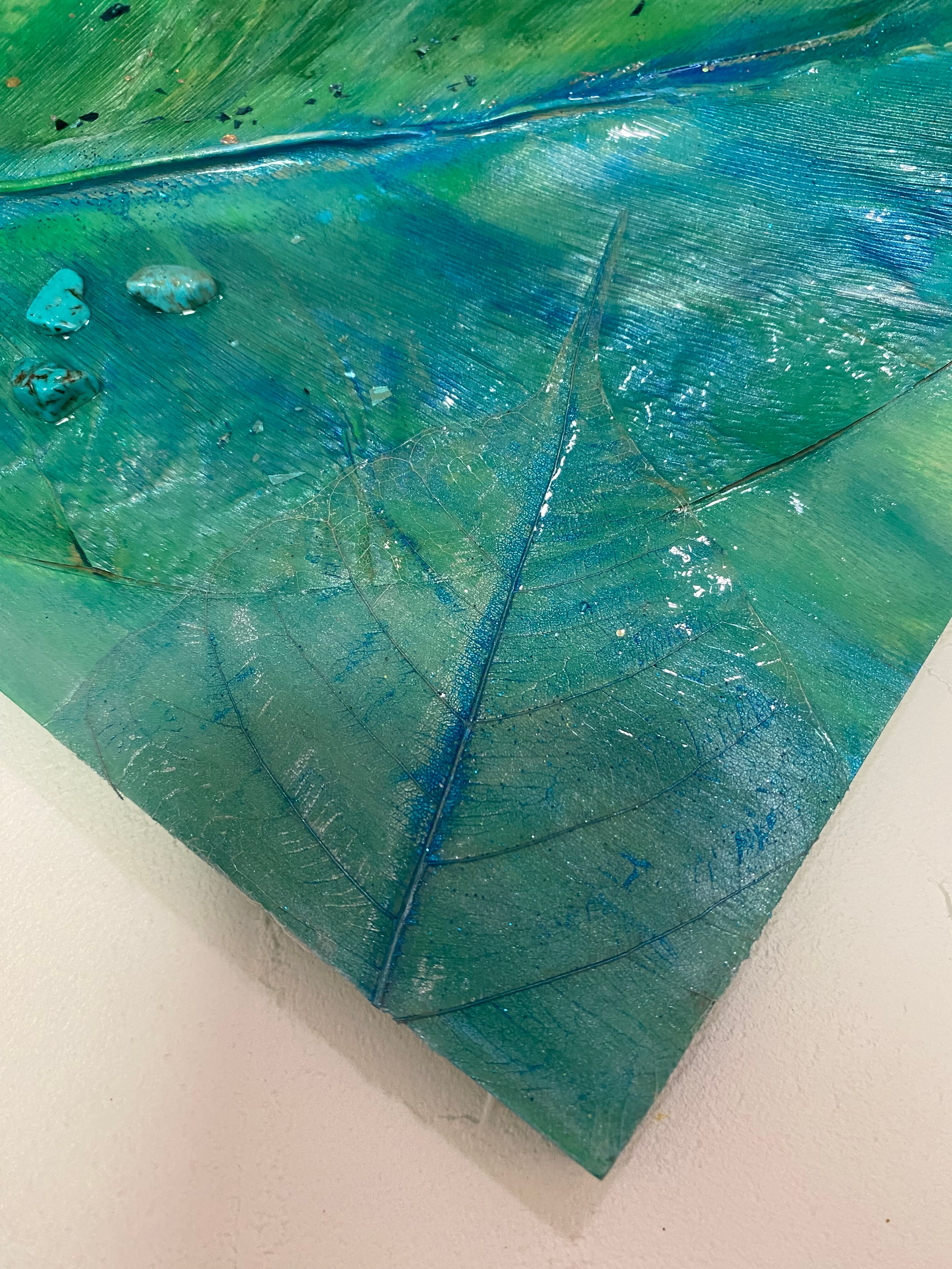 本物のカラテア・ルテアとインド菩提樹の葉、そしてターコイズの天然石を贅沢に使用した、心躍る一品です。