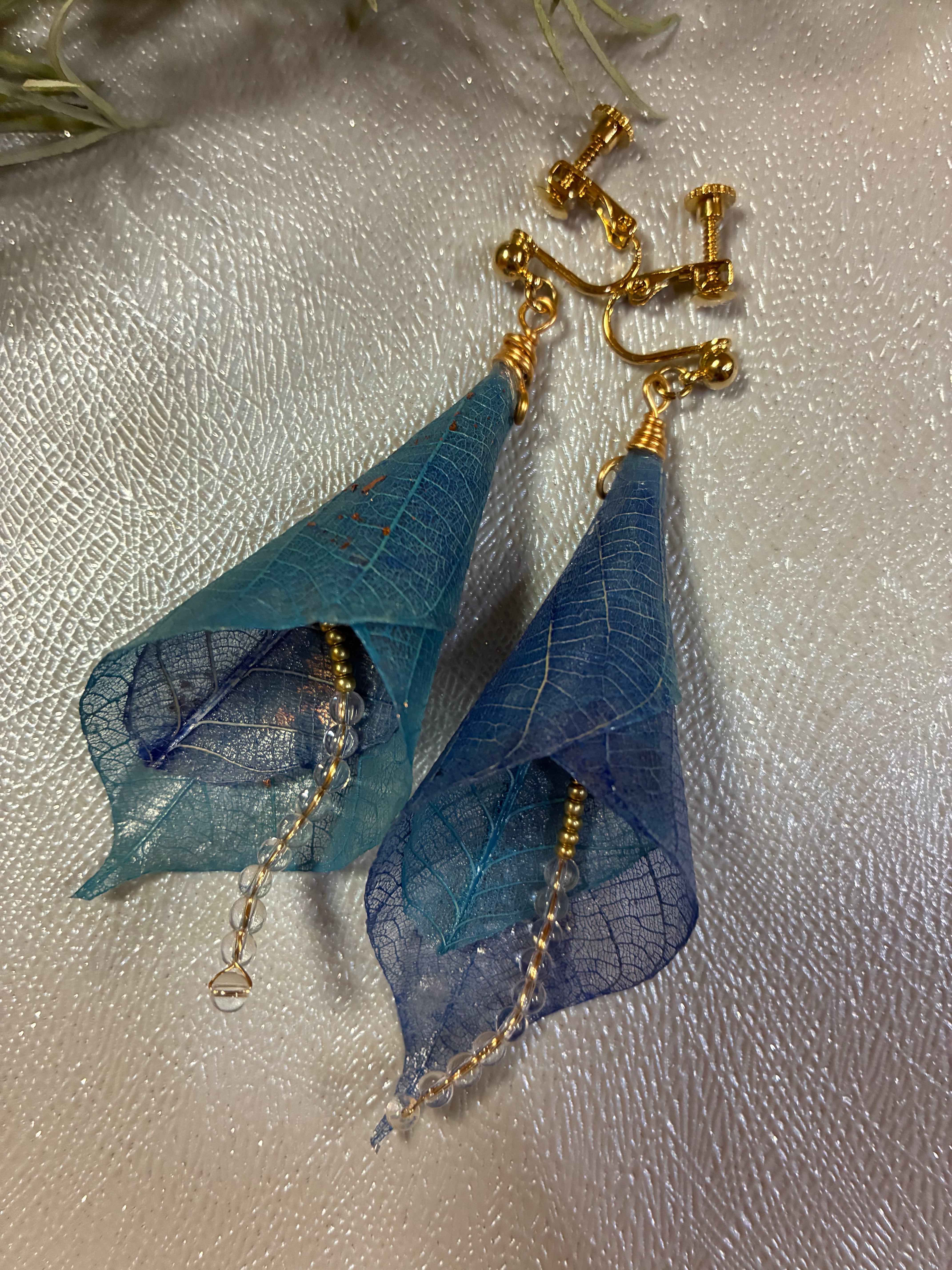 ゴムの葉のイヤリング ブルー系