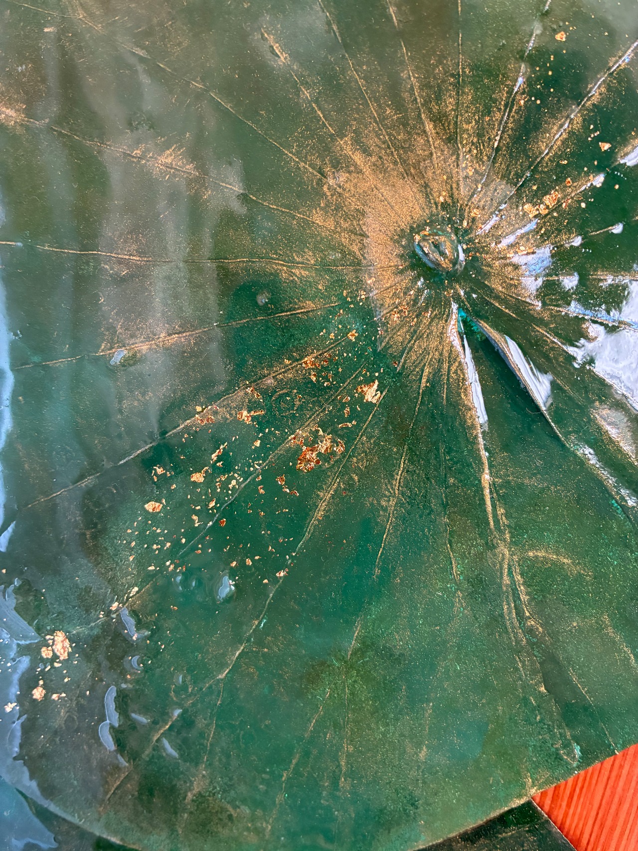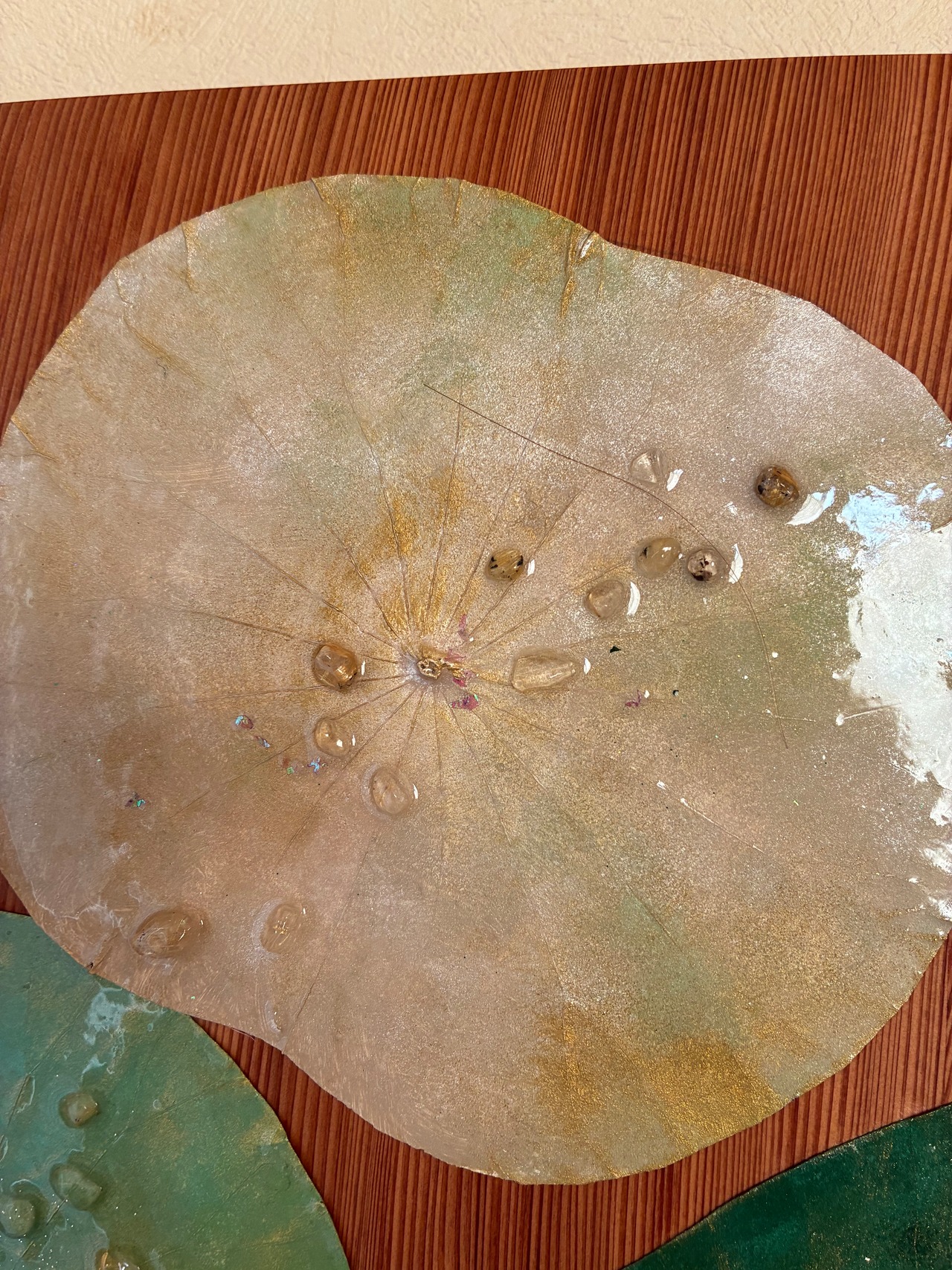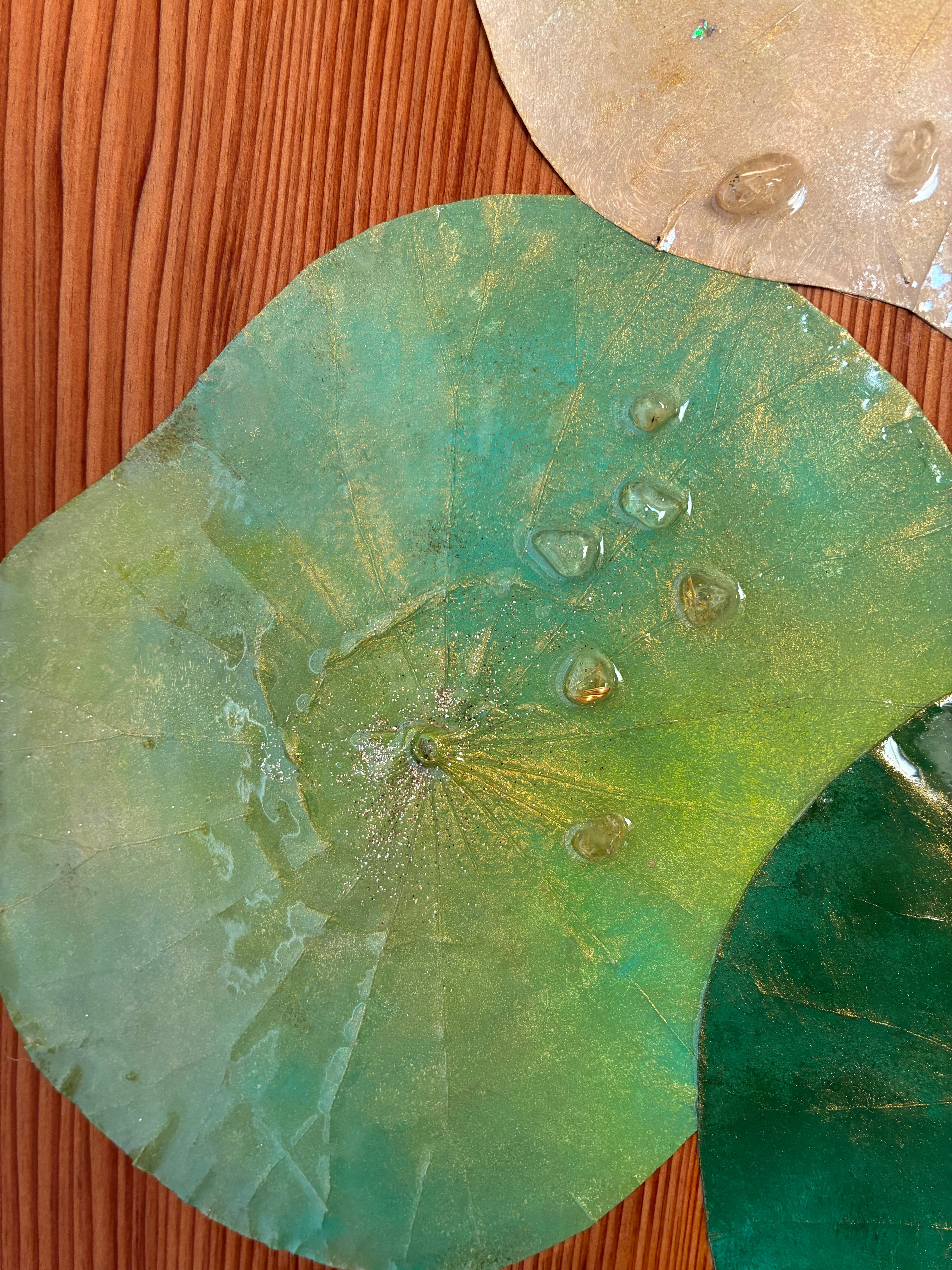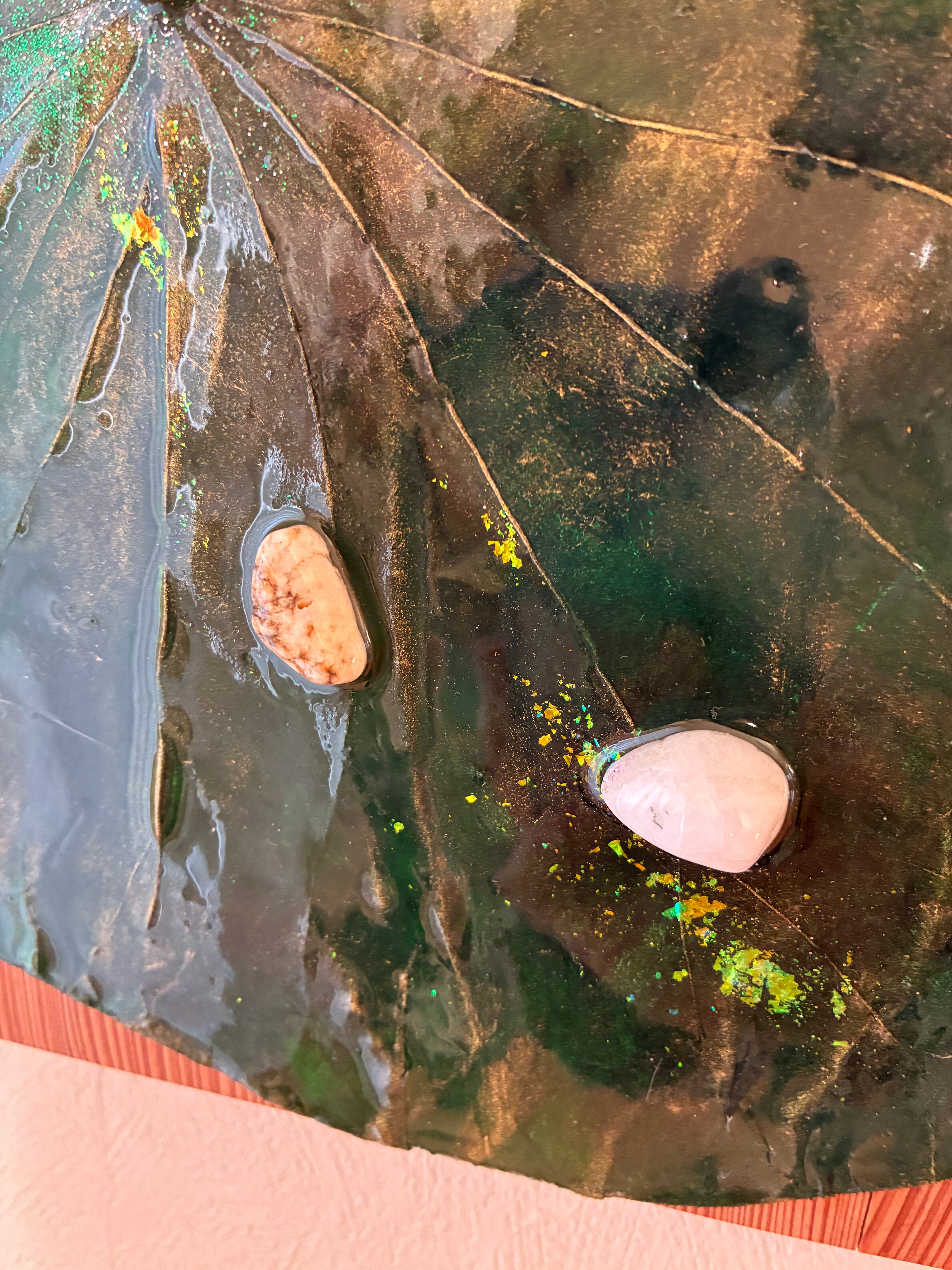 四枚の蓮の葉と、おのころ水晶、ゴールドルチルの天然石をあしらった作品です。