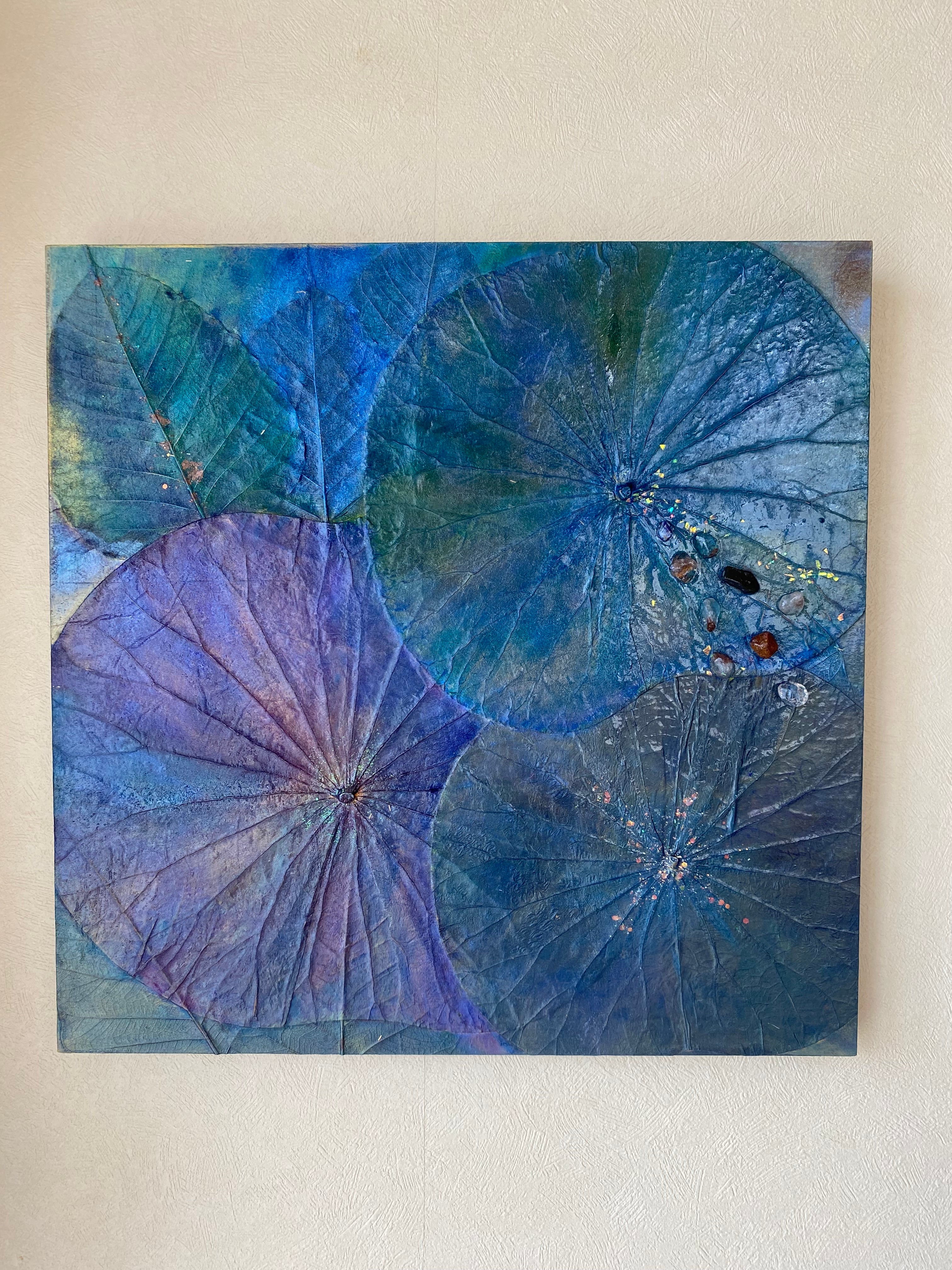 天然の植物の葉をパネルに貼り付け、絵の具で着用したアートです。