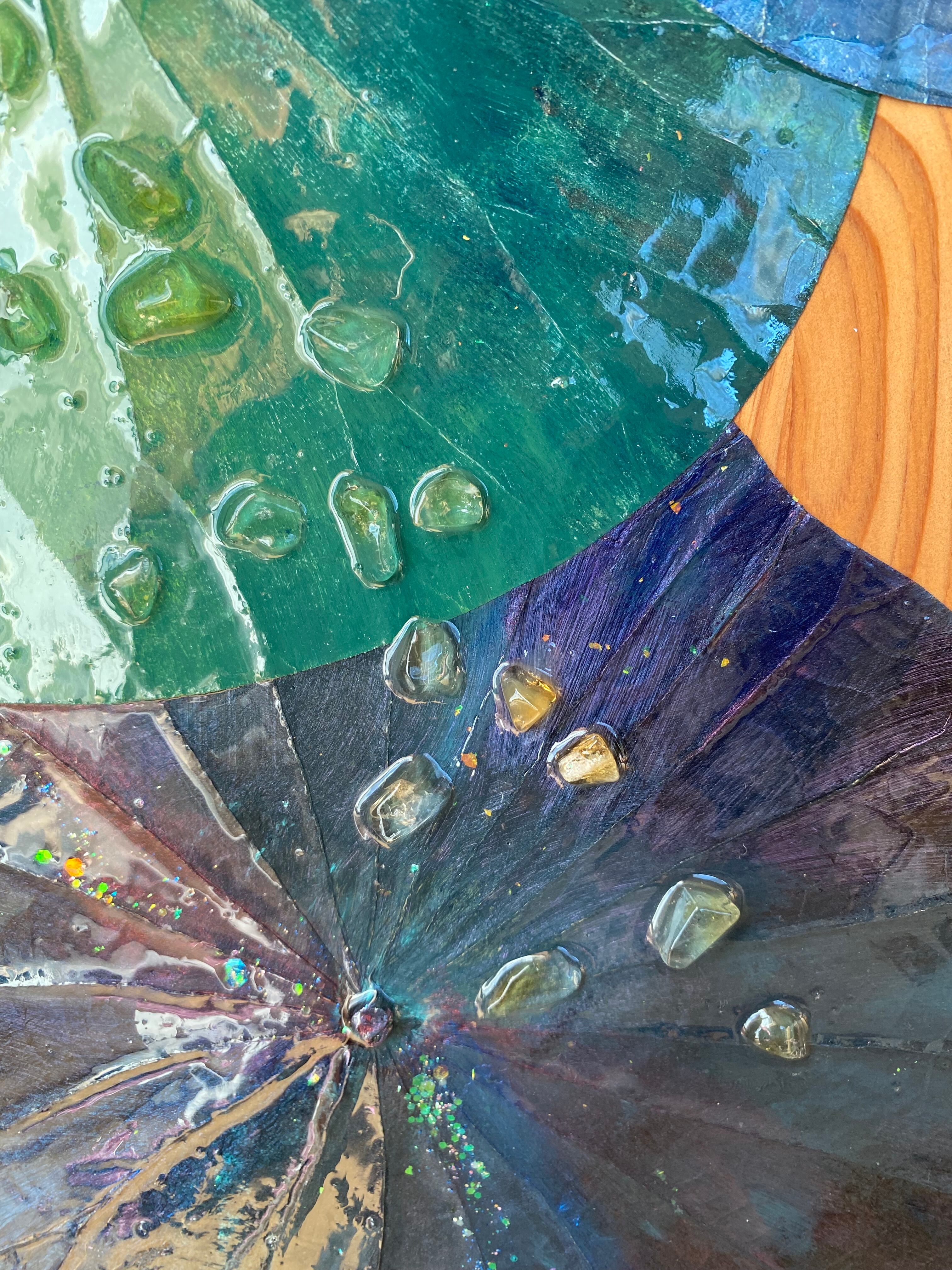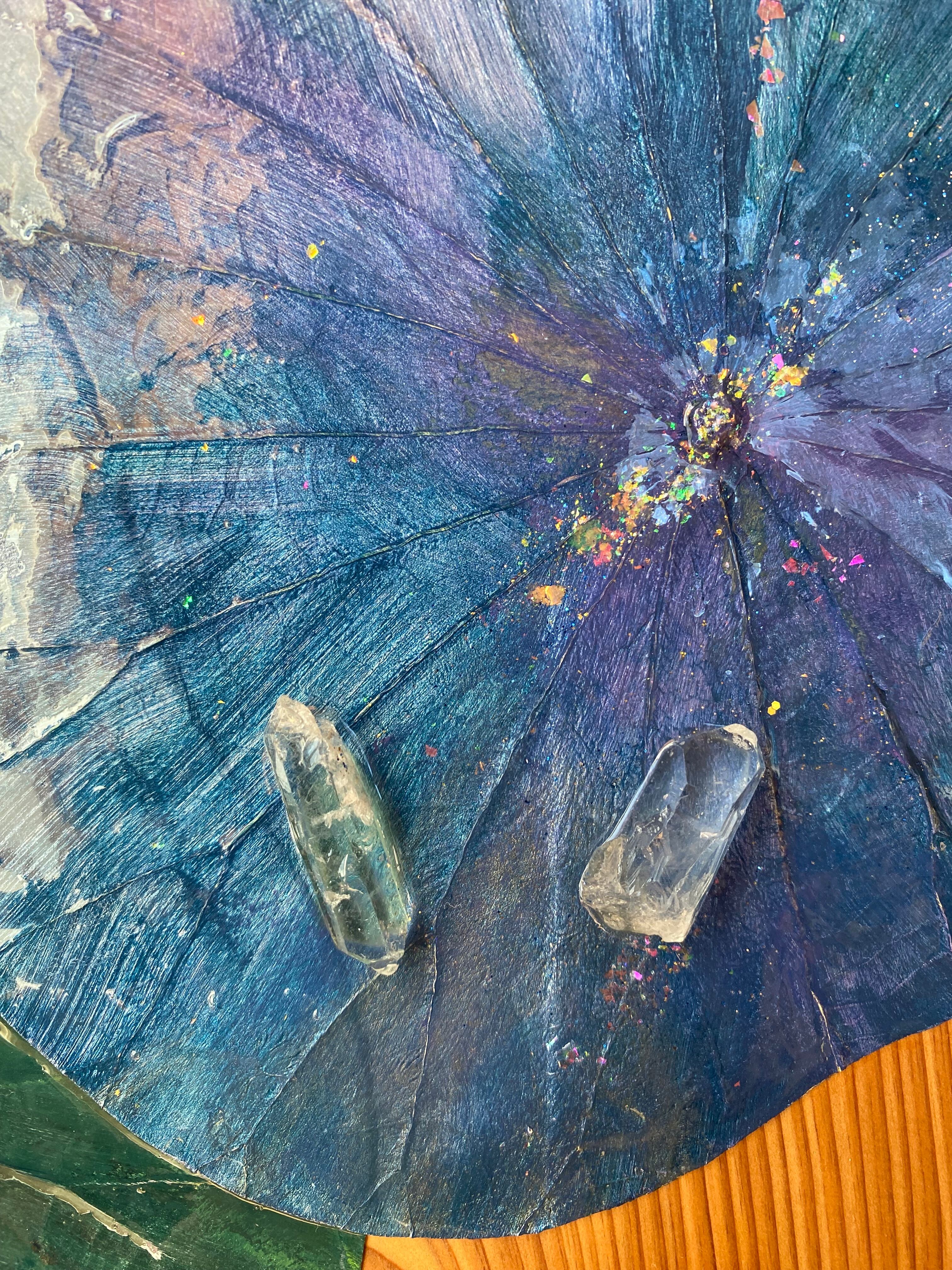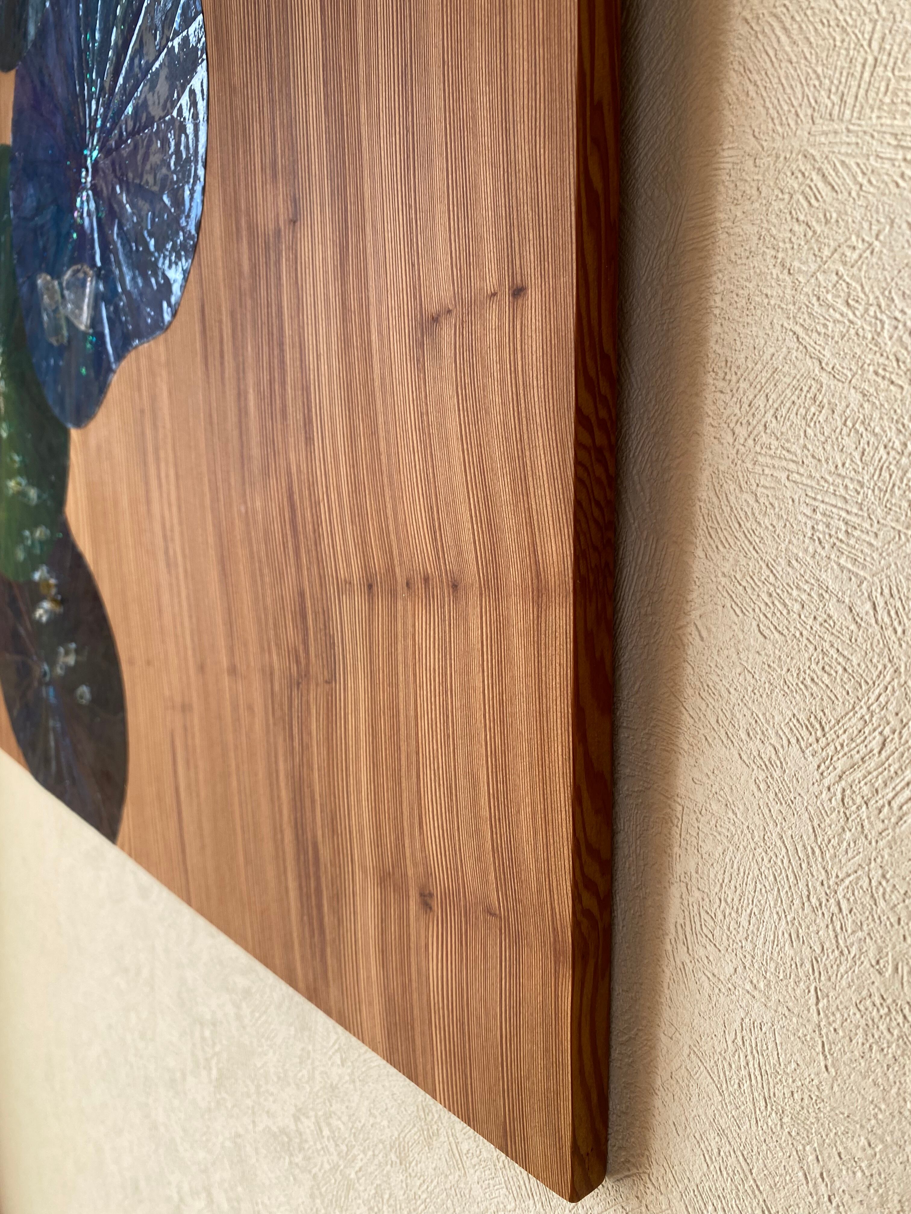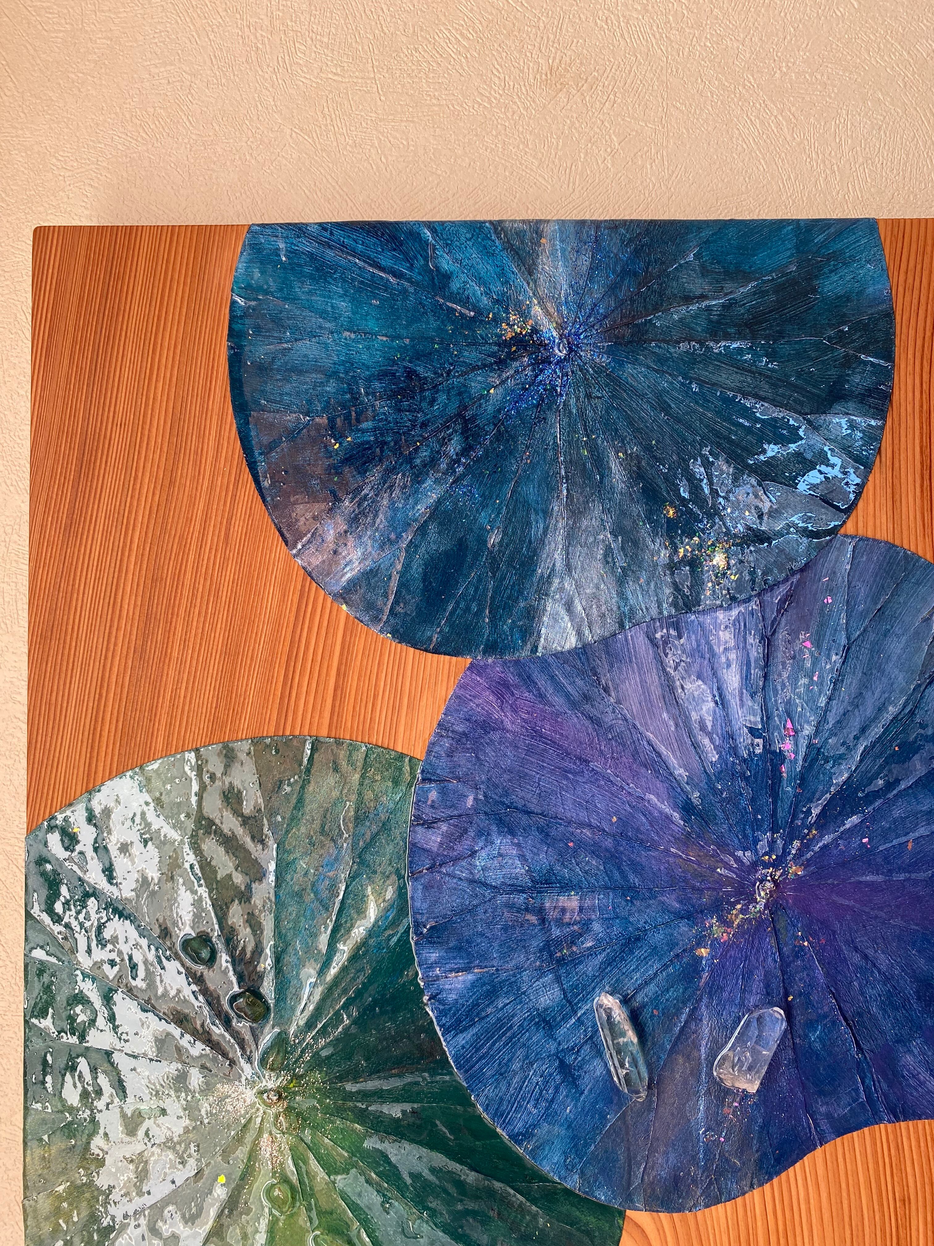 ボタニーペインティング 【宇宙の叡智】 櫢齢千年の屋久杉の板 蓮の葉と水晶ポイントとシトリンの天然石