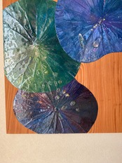 天然の植物の葉をパネルに貼り付け、絵の具で着用したアートです。